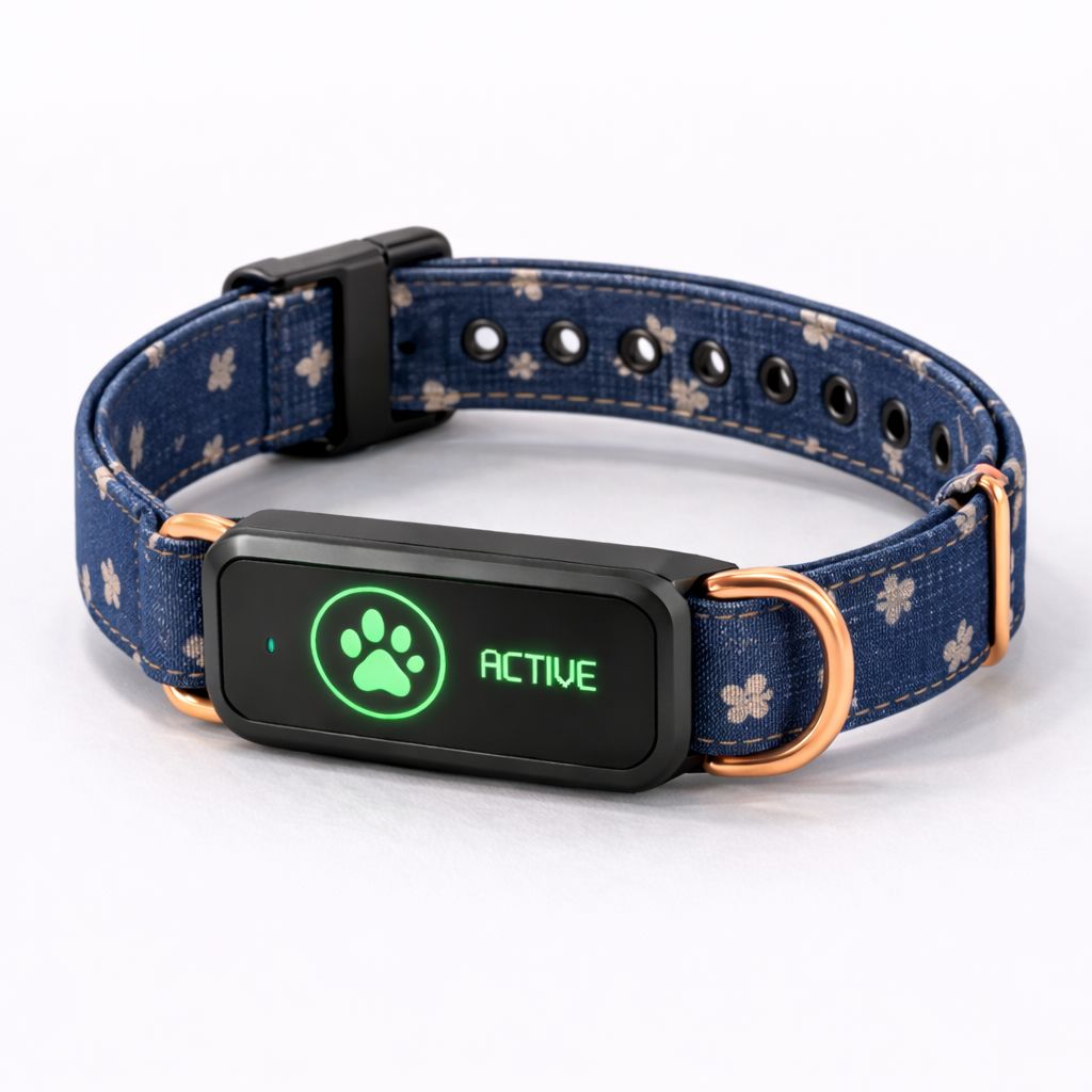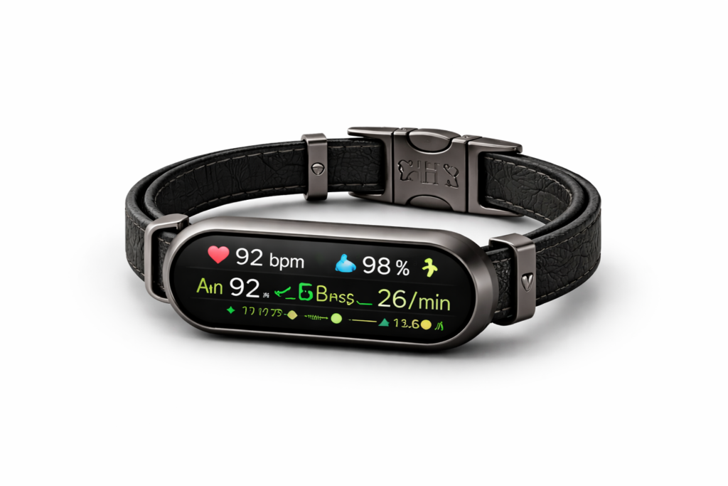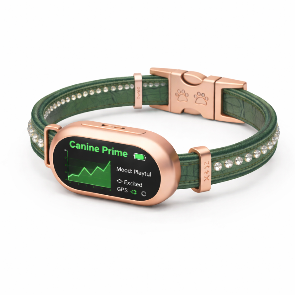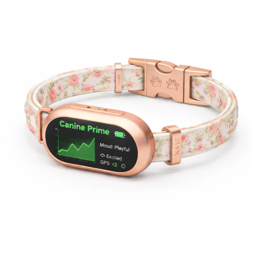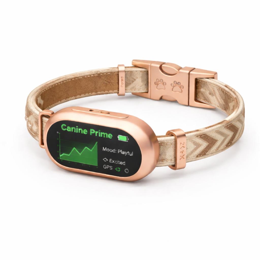 A sophisticated collar combining emotional intelligence, health monitoring, GPS safety tracking, and vet-ready reports.