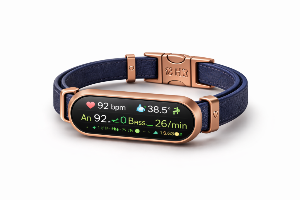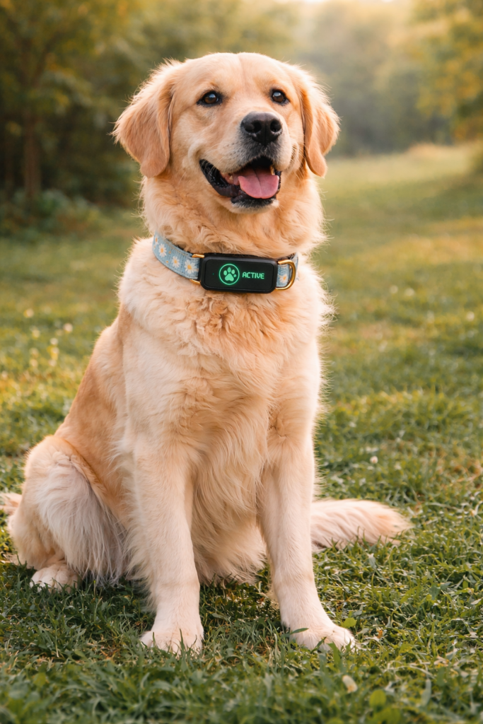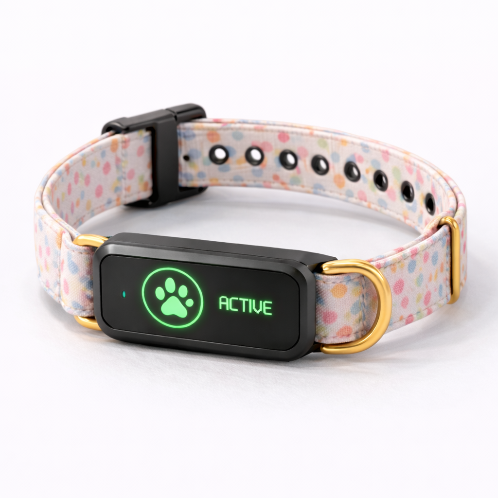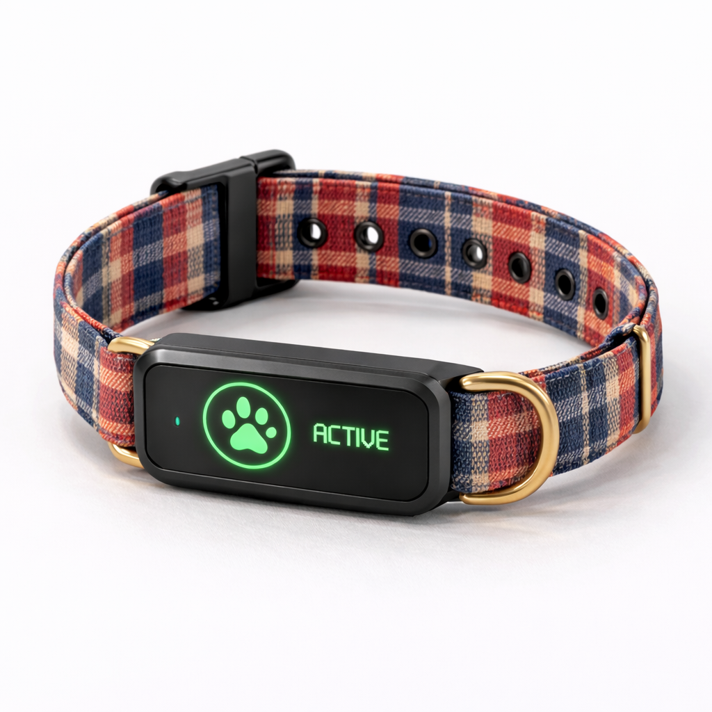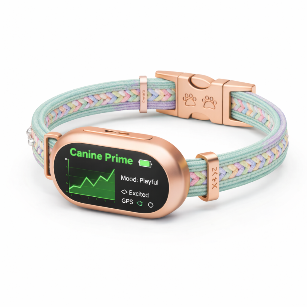 A sophisticated collar combining emotional intelligence, health monitoring, GPS safety tracking, and vet-ready reports.
