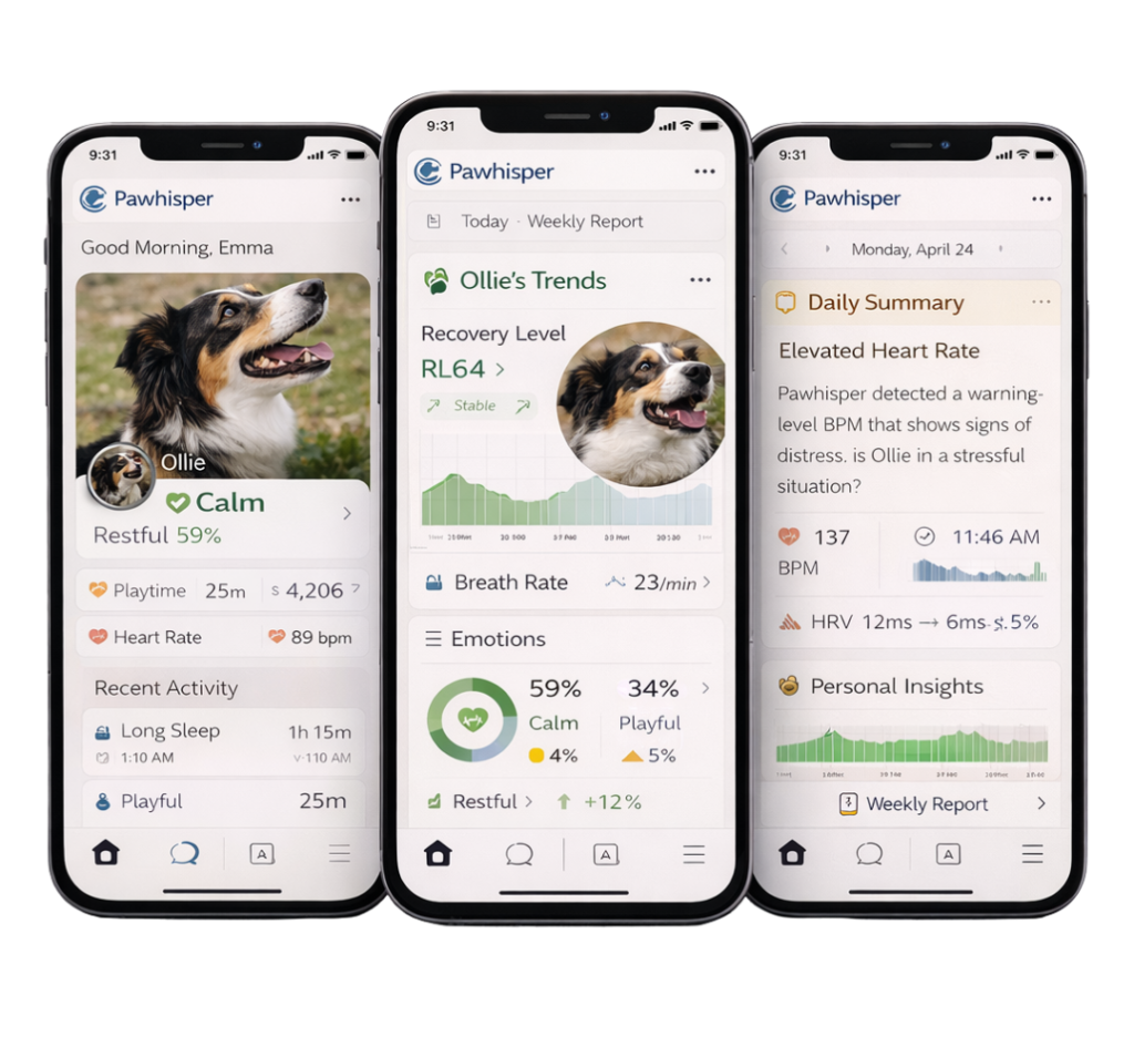 Pawhisper collars are designed as a tiered ecosystem from everyday emotional awareness to clinical-grade canine health intelligence.